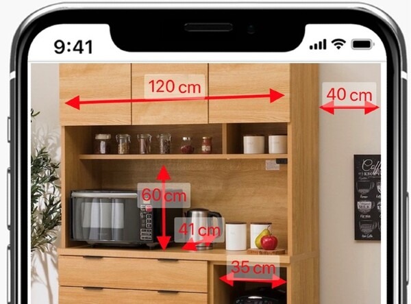 スマートフォンのAR(拡張現実)機能を使って、写真を撮りながら気になる場所のサイズを計測できる。大きさなどが記載された画像が生成され、画像は、編集・保存ができメモとして利用できる。※ARKitあるいはARCore対応端末で使用可能