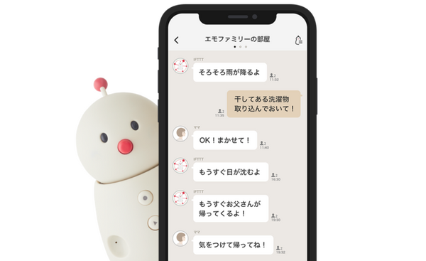 専用のBOCCO emoアプリは、家族内でのメッセージのやりとりや、センサーの反応を確認することができる家族専用掲示板。BOCCO emoに話しかけると、音声メッセージと音声認識でテキスト化されたメッセージがスマホに送信される。また、スマホからはテキストか音声でメッセージを送信することができる。子どもや高齢の親などスマホを持たない家族とも簡単にコミュニケーションをとることができる。