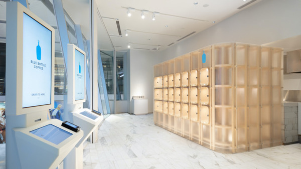 オーダー専用端末でメニューを確認し、タッチスクリーンで注文。ブルーボトルコーヒーのバリスタが淹れたコーヒーは、受取専用ロッカーから提供する。バリスタがコーヒーをロッカーにセットすると、ロッカーのセルが光って出来上がりを知らせる。非接触ソリューションの需要が高まる中、注文から商品提供までを非対面で行うことのできる新形態のカフェで、新しいコーヒー体験を提供する。