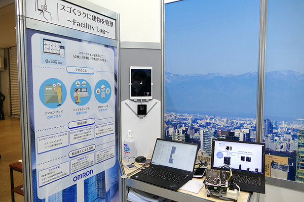 今回、オムロンではロボットの他に、現在は紙で管理されているビルの運営・管理負荷をデジタル化技術で低減するためのデータ活用プラットフォーム「Facility log」のほか、センサー類を使ったリアルタイム・モニタリングや故障予兆の発見ソリューションを参考展示していた。これらも「インプットされた社会課題に応える」ことを目指したソリューション群だという。