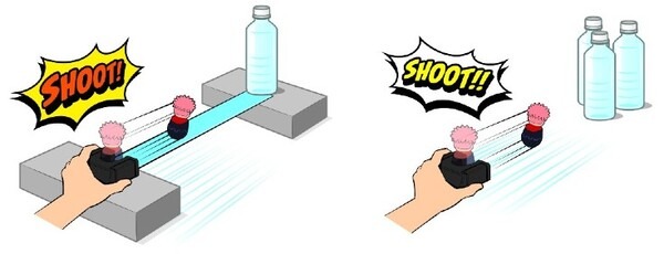 台座シューターとペットボトルなどの的を使った遊びや、台座シューターを使って相手をリングから弾きだすバトル、フィギュアを指で弾いて競うカーリングバトルなど1人でも2~4人でも楽しむことが可能だ。