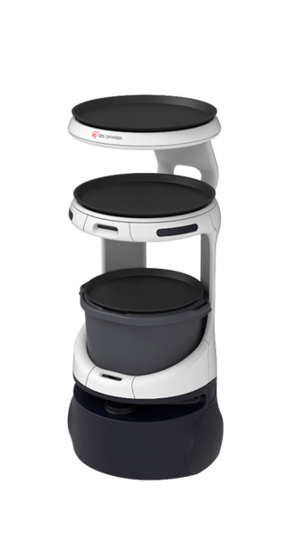 配膳・運搬ロボット「Servi」は360°どこからでも料理などの運搬物を載せられ、総積載量も35kgと、重い食器や複数の料理なども一度に配膳する事が可能。高性能のセンサーを装備し、スムーズかつ安全な移動を実現。前方死角なしで、人や物を滑らかに避け、料理などを安定的に運ぶ。最短60cmの幅を通過することが可能で、人とのすれ違いもスムーズ。