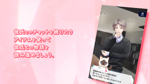 彼氏とのチャットを続けたり、アイテムを使って彼氏とのストーリーを解放することができる。フルボイスでの物語を楽しむことができる。