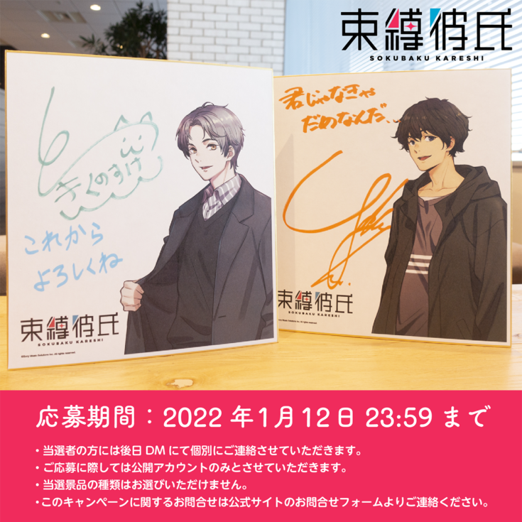 「新藤 暁」と「松来 弦」の声優を担当している戸谷菊之介さんと八代拓さんの直筆サイン入り色紙(各10枚計20枚)をプレゼントする「束縛彼氏Twitterフォロー&リツイートキャンペーン」を実施する。応募期間は2022年1月12日(水)23時59分まで。