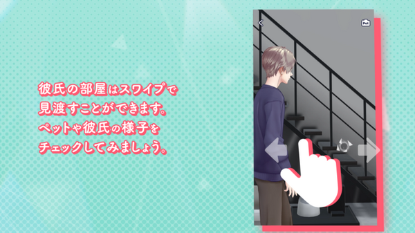 ストーリーを進めていくと解放される「ペットカメラ」機能では彼氏の部屋をのぞき見ることができる。左右スワイプで部屋を見渡すと、彼氏やペットの様子をチェックできるかもしれない。