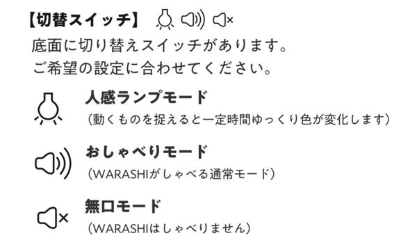 WARASHIの本体底面には「人感ランプモード」「おしゃべりモード」「無口モード」の3段階の切り替えスイッチが付いている。無口モードでは光のみでワラシはしゃべらなくなる。また人感ランプモードでは一定時間動く物体に対してのみ反応し、ゆっくり色が変化する「人感ランプ」として使用できる。
