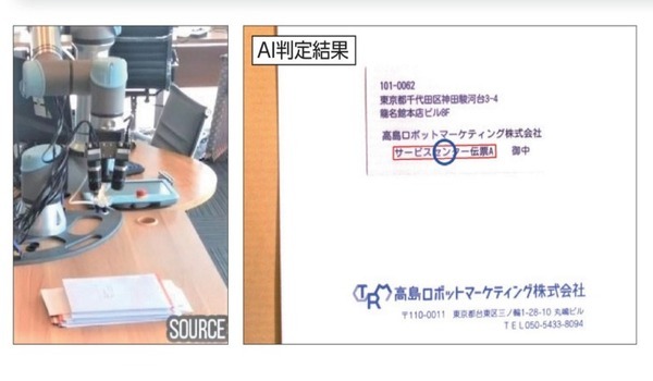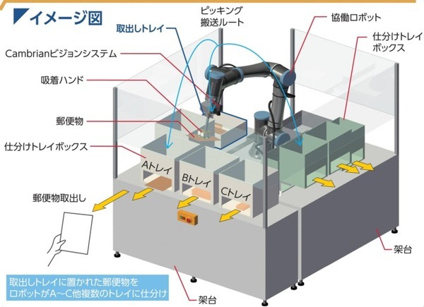 「郵便物自動仕分けシステム」は高島ロボットマーケティング取り扱いのユニバーサルロボット社製協働ロボットと、ディジタルメディアプロフェッショナルが取り扱う協働ロボット向け画像認識システム「Cambrian」3DビジョンシステムとAI文字認識ソフトウェアを組み合わせたもの。郵便物の形状、表面上に印字された文字、コード及び企業ロゴなどをAI搭載のCambrianビジョンシステムが高速スキャンし自動判定。協働ロボットが郵便物を吸着、指定されたトレイに仕分けする。