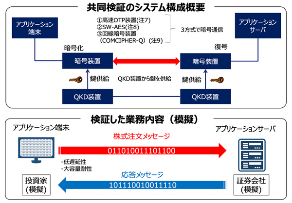 検証に際しては、東芝が開発した高速QKD装置及びNECが開発したQKD装置で交換した鍵をもとに実際の株式トレーディング業務に沿ったテストケースを設定し、大容量データ伝送時に複数種類の異なるデータ暗号化方式の応答時間を計測することを通じて、QKDならびに各暗号化方式の実用性を検証した。
