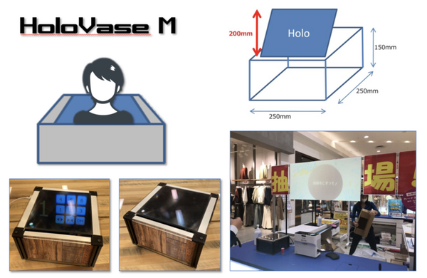 従来のサイネージやコミュニケーションロボットと比較し小型かつ低コストを実現し、様々な場所への設置が可能となっている。弊社独自のHoloVase専用アプリケーションを使い、ホログラムのVR店員(xR Cast)を使った接客、スマートフォンの前後カメラやセンサーを使った様々なインタラクションやシステム連携、音声認識や画像認識による商品紹介や、バーコード決済、アミューズメントやプロモーションなども含め様々な用途への活用が期待できる。(公式ホームページにデモ動画もあり)