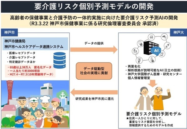 同研究は神戸大学が主体となり、日立が開発した独自の説明可能なAI技術を活用することで要介護リスク予測のブラックボックス化(解析根拠が不明)の解消をめざし、神戸市民38万人の健康・医療ビッグデータから、住民一人ひとりに対する要介護リスクの予測及び予測根拠を提示する方法を開発する。研究成果の要介護リスク個別予測モデルは神戸大学から神戸市に提供され、神戸市の保健・介護政策づくりに活用されることが期待される。