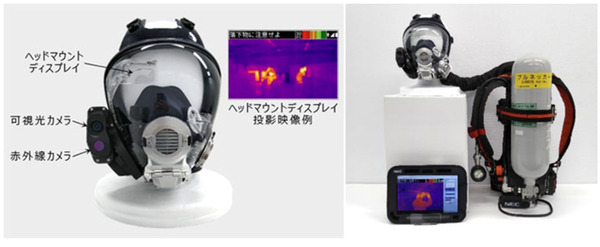 スマートマスクは、火災現場などで消防隊員が着装する空気呼吸器の面体に、ヘッドマウントディスプレイと赤外線カメラ・可視光カメラを搭載、赤外線カメラ映像により暗闇や濃煙下での活動や要救助者の検索活動を支援する。