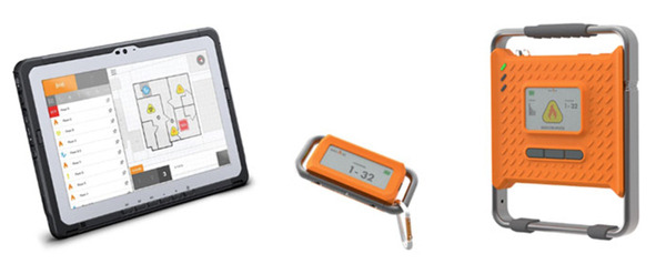 GPSが届かない屋内で、モバイルビーコンを装着した消防隊員の位置情報を確認できる屋内位置測位システム。予め設置された位置情報を取得するためのインフラは必要としない。現場到着時にアンカービーコンを設置することで、複数の消隊員の現在位置がリアルタイムにタブレット端末に表示され、活動状況の把握が可能となる。