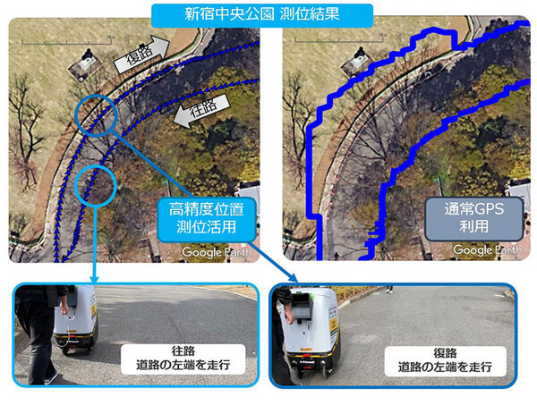 自動配送ロボットでは5G通信のほか、高精度な位置測位ができるPPP-RTK方式がKDDIによって試された。この技術は従来からあるGPSが数メートルの誤差があるのに対して、数センチメートル級の少数誤差で自己位置を測位することができるもの。実践の結果、ロボットがより正確に走行ルートを移動できることが確認できた。