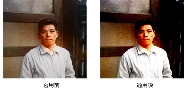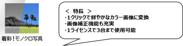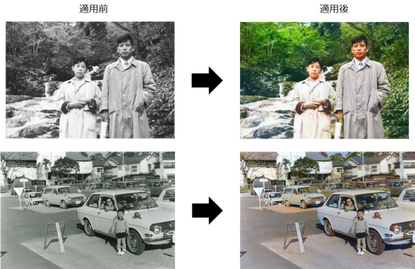 「着彩!モノクロ写真」はAIが学習したデータを元にモノクロ写真を解析し、人や空、森林、海などを認識して1クリックで自動的に着彩するソフト。まるで当時の雰囲気を再現するかのように、自然な色味に仕上がる。