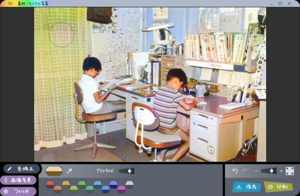 AIでのカラー化の後、気になる箇所をお好みで着色することができる。色とブラシのサイズを選択し、マウスで自由に修正できる。