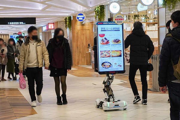 ロボットに装備した大型ディスプレイにサイネージ広告を表示する機能があり、サイネージの前にいる通行者の属性に応じて掲示する広告を切り替えることもできる。