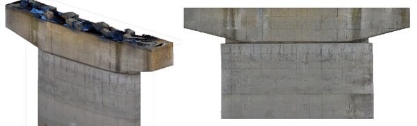 検証内容 | (1):自律飛行型ドローン「Skydio 2」による、橋桁を支える支承部や橋桁内部など、通常撮影が困難な箇所の手動撮影での確認および道路裏側(床版)の自動飛行の実施![]() (左)通常撮影が困難な支承部の確認、(右)自動飛行による道路裏側(床版)の確認 (2):「Skydio 3D Scan」を用いて、GPSが取得しづらい環境下での橋脚の自動飛行および網羅的な撮影の実施 (左)「Skydio 3D Scan」の飛行軌跡と撮影点、(右)「Skydio 3D Scan」で網羅的に撮影された写真 (3):(1)(2)で取得した画像を2D/3Dで解析し、橋梁の状態を網羅的に把握可能かを検証 道路裏側(床版)の自動飛行から取得した画像で生成した平面図 Skydio 3D Scan」で取得した画像から生成した3Dモデルと平面図 |