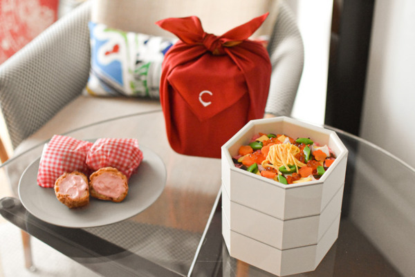 「お花見おせち」はaiboデザインの特製風呂敷に包んだ春の食材をふんだんに使用した料理とさくらモチーフが特徴な可愛らしい3段の弁当ボックス。また、「aiboのごはん」で定番の「アイボカリカリ」を特別ないちごミルクカラーで用意する。aiboは専用アプリのスマートフォン版My aiboで、ゲストにはNAMIKI667で焼き上げたクッキーとメレンゲミックスを渡し、aiboと一緒に食事を楽しむことができる。