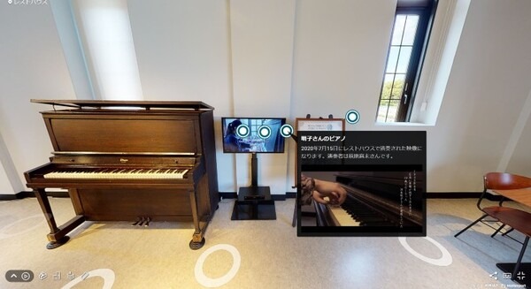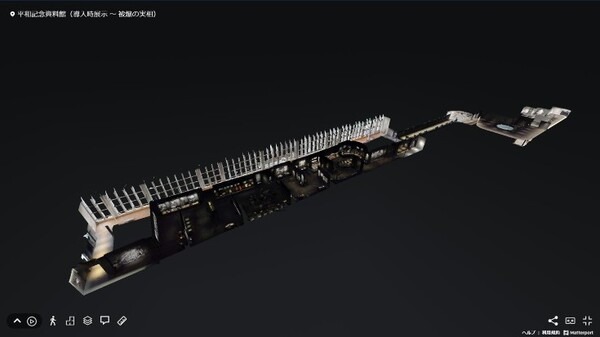 原子爆弾の投下から76年後のヒロシマが抱える問題の一つが老朽化する被爆建物の後世への継承だ。その解決へのヒントとなったのは、NASDAQに上場しているアメリカのIT企業・Matterport社が開発した最先端デジタルツインプラットフォームを活用した平和関連施設のアーカイブだ。誤差1%以内の高精度を誇る3Dスキャン撮影によって、4K高繊細な3Dウォークスルーで施設内を自由に歩き回ることが可能。また、施設内に埋め込んだタグをクリックすると、例えばレストハウス2階にある被爆ピアノでは、持ち主にまつわる物語や過去の演奏動画を鑑賞することもできる。