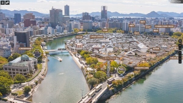 Matterportで制作したデジタルツインを空から繋ぐのが、特殊ドローンで空撮した8K高繊細画像をシームレスに繋ぎ合わせた360°空撮ポータルサイトだ。また、各施設をクリックすると、360°ビューやMatterportのデジタルツインコンテンツが立ち上がり、まるで施設内の空間を歩き回っているかのようにウォークスルーできる。さらに、AR技術と組み合わせることで、戦前の街並みを合成。スマートフォンなどのモバイルデバイスにも対応しており、平和記念公園を歩きながら当時の賑わいに想いを馳せる体験型コンテンツだ。なお、同ポータルサイトは、空撮ポイントやMatterportポイントを加えるなど、将来的な拡張性にも優れている。