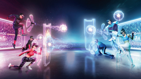 「HADO」は頭にヘッドマウントディスプレイ、腕にアームセンサーを装着して対戦するARスポーツ。自らの手でエナジーボールやシールドを発動させ、フィールドを自由に移動し、仲間と連携しながら最大3対3で対戦を楽しめる。