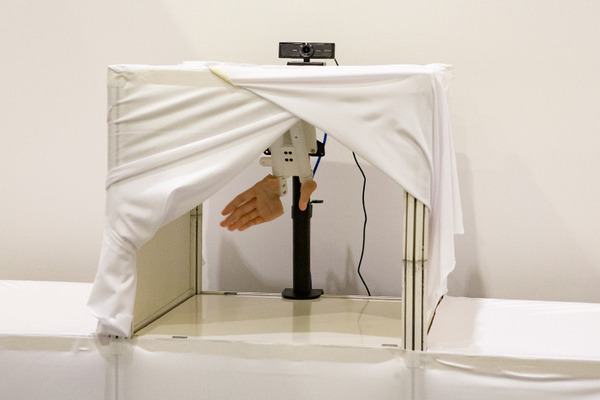 呼びかけられた参加者はブースに入り、VRゴーグルとヘッドホンを装着。握手ハンドを握る。