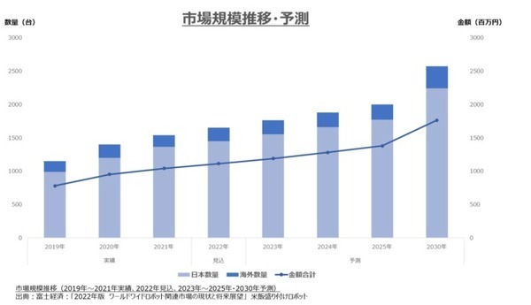 ご飯盛付けロボット市場は衛生面や盛り付けのムラの改善、人手不足対応手段として外食、小売店、ホテルなどのバックヤードを中心に導入されてきた。日本国内では各業種ともにオペレーションの効率化を図りたい大手チェーン中心の採用から、緊急事態宣言後の2020年以降は個人事業主の外食店舗へとすそ野が広がり、市場が底上げされた。外食・小売・宿泊業の人手不足は深刻化し、省人化や業務効率化の手段が求められており、さらなる成長が期待されている市場となっている。海外でもご飯食の需要が高まっており、大手外食チェーンの海外出店が回復すれば、日本食レストラン等での需要が見込めるため、海外市場でも右肩上がりでの市場推移が見込まれている。