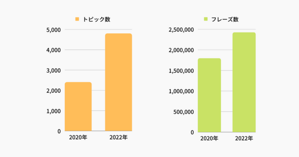 2020年と比較し、トピックは倍以上の2,397個追加されて合計4,798個、そのトピックに関連するフレーズは629,388文追加され、合計2,421,622文になった。特に、トピックは競合他社に比べて6倍以上(同社比:日本国内の英会話AIを開発・提供している4社と比較)に対応し、圧倒的にバリエーション豊かな話題を提供している。