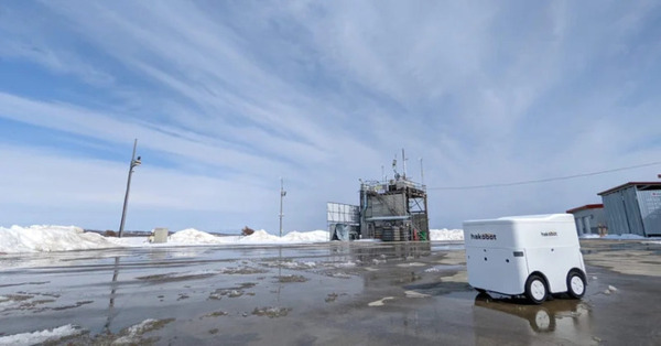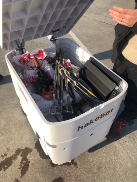 今回HOSPOで実証実験を行ったのは、自動配送ロボットの走行ユニット部分「Hakobase」(ハコベース)の試作機で、重量60kg、幅660mm、長さ916mm、高さ760mm、リモコンでの操作によって電力で稼働するロボット。自動走行は実装しているが、今回は走破性の実験のためリモコンでの操作で行った。今回の実証実験では悪路(雪道や凍結した地面等)での走行性能テストと、ものづくり現場等の実際の作業環境での走行テストを行い、今後の商品開発のヒントとなる貴重なデータを得ることができたとしている。