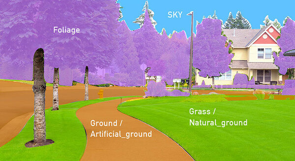 セマンティックセグメンテーションとは、カメラに映る景色をAIが解析・理解する技術で、地面、空、水、建物など環境中のさまざまな要素を即座に識別することができる。
