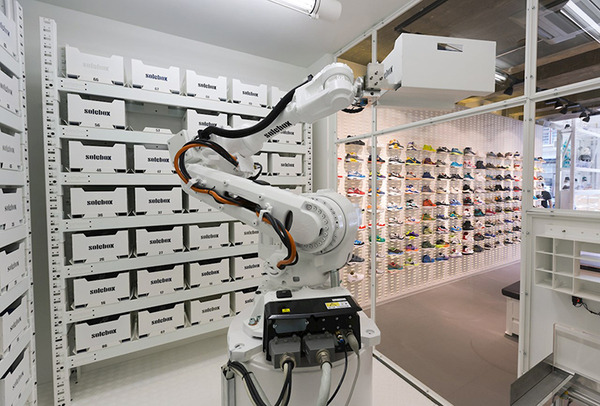 一例として、ドイツのファッション小売店Solebox社のベルリン店でのABBのロボットによるデモでは、顧客が選んだ靴を、スクリーンを使ってピッキングしている。靴が合わなかったり、他のものを試したりしたい場合は、ロボットが引き出しから靴を取り出し、棚に戻す。