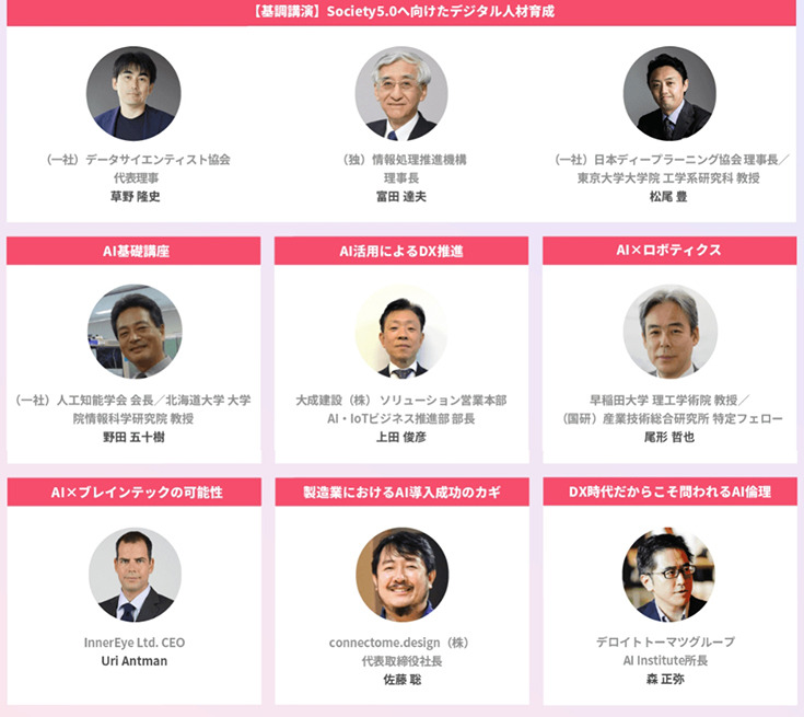 産業界におけるデジタル人材育成加速への取り組みの最新動向を、デジタルリテラシー協議会 協議委員がセッション形式で進めたり、深層学習や様々な人工知能技術の応用事例を紹介し、どのように問題の捉え方が変わって来ているか等を解説するセミナーも用意されている。