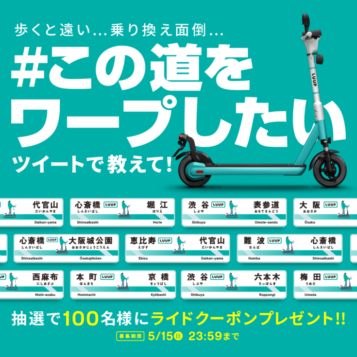 LUUP公式Twitterアカウント(@Luup_Official)をフォローした上で、「#この道をワープしたい」のハッシュタグをつけて、LUUPで移動したいと思うルートを投稿するキャンペーン。期間中に投稿した人の中から抽選で、100名に30分間ライド無料クーポンをプレゼントする。期間は2022年4月25日(月)12時~5月15日(日)23時59分まで。