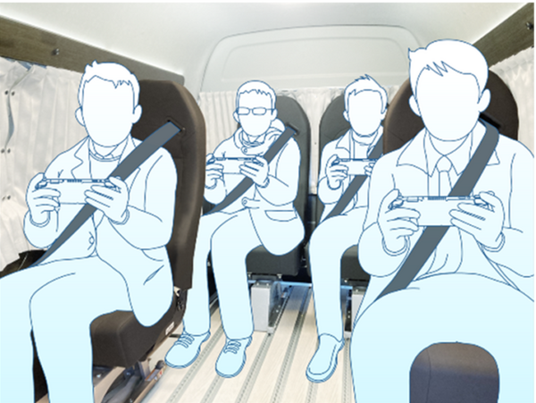 複数のレールを活用した専用フロア構造により、後席の取り外しや移動、テーブルの設置(駐車時のみ)などを、工具を使わずに自由に行える架装車両。電源や照明、テーブル、モニターなどを装備しているため、オンデマンドバスなどでの利用だけでなく、移動先での商談スペースやオフィスとしての利用、物販や行政サービスの提供など、さまざまな用途で活用することができる。