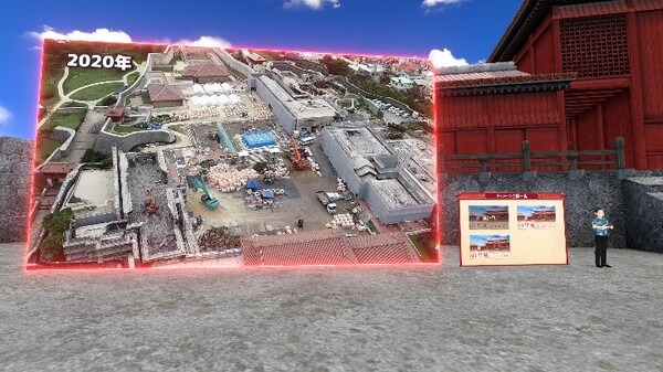 すでに公開中の「国際通りエリア」「ビーチエリア」に続き、今回展開した「首里城エリア」では、観光地の首里城公園にある守礼門から首里城正殿までを忠実に再現。ただ見て楽しむだけでなく、エリア内にいるガイドに話しかけると首里城の歴史や雑学について学ぶことができ、新たな発見を楽しめるエリアになっている。また、現在復興中の首里城の様子を確認できる「ドローン映像」が見られるエリアも設置。ドローン映像は復興の進捗に合わせて更新予定となっている。