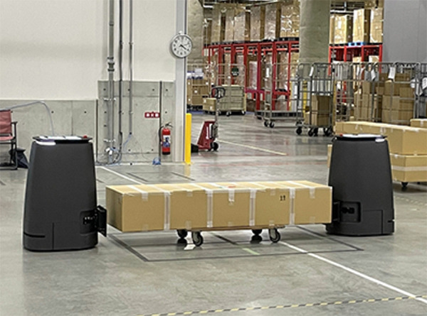 どう実証実験では、2台のロボットでユニットロード(カゴ車、平台車等の荷物搬送機器)を挟み込む形で搬送を行う。これにより、ユニットロードの大きさや形状にかかわらず、搬送時にロボットに固定する治具などが不要となり、作業員のサポートなしに自動搬送することができる。また同ソリューションでは、倉庫に設置したカメラから得られる情報を集約し複数ロボットを一括して制御を行うため、搬送ルートの指定やレイアウト変更への対応などを容易に行うことが可能だ。