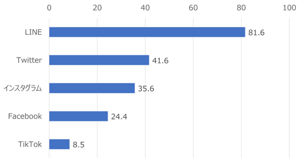 続いてTwitterが 41.6%、インスタグラムが35.6%、Facebookが24.4%と続いた。また若年層に人気があるTikTokも8.5%の利用率があった。