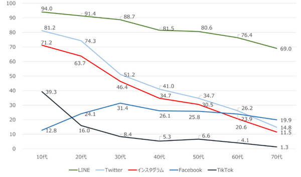 LINEが全世代で利用率が高い・10代で4割がTikTok利用