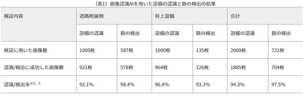 この検証の結果が下記の表1。道路附属物と柱上設備の合計で、画像2000枚中1885枚において設備を正しく認識し(認識率94.3%)、錆がある画像722枚中704枚において錆を正しく検出した(検出率97.5%)。