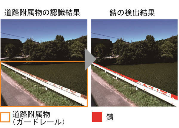 MMSによる実地でのインフラ設備の撮影は、西日本電信電話株式会社が実施した。撮影に用いたMMSが図1。今回の撮影では、MMSで沿道のインフラ設備を一定間隔で撮影し、横向きのデジタルカメラによって道路附属物(ガードレール、標識、ミラーなど)の画像、上向きのデジタルカメラによって柱上設備(金物、ケーブルなど)の画像を取得した。取得した道路附属物の画像1000枚(設備に錆がある画像は587枚)、柱上設備の画像1000枚(設備に錆がある画像は135枚)に対して、画像認識AIを用いた設備の認識と、各設備の錆の検出を行った。