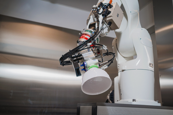 ランダムな位置と姿勢の食器をピックアップする場合については予め動作を記憶させることは困難。finiboでは即時に適切な軌道を計算し、ロボットの各モーターに直接指示を行うことで、動作を行う。