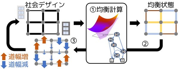各ユーザが自由に経路やリンクの組合せを選択しても、結果的に混雑せずにユーザのコストが低くなるような、最適な社会デザインを効率よく求める手法を開発した。