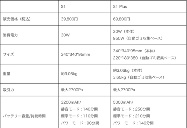 SwitchBotロボット掃除機S1/S1 Plusの仕様