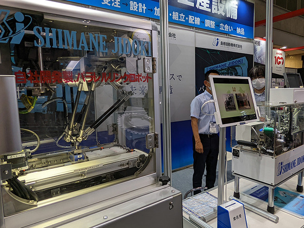 小型のロボットは、限られたスペースで用いることができるので、より大型のロボットのちょっとした面倒を見たり、専用機へのワーク投入などに使われている。島根自動織機の小型パラレルリンクロボットもその一つ。他の自動機械のなかに組み込むことができる。