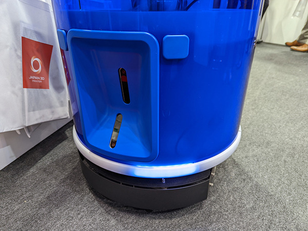 大塚化学株式会社は、日本3Dプリンター株式会社のブースで、同社が開発した熱溶解積層方式3Dプリンタ用材料「ポチコンフィラメント」を使ったコンセプトロボットを出展していた。内部にはドリンクが入っていて、それを提供するためのボールネジや減速機、回転機構などを全て3Dプリンタで造形したというもの。足回りはスマートロボティクス社による。