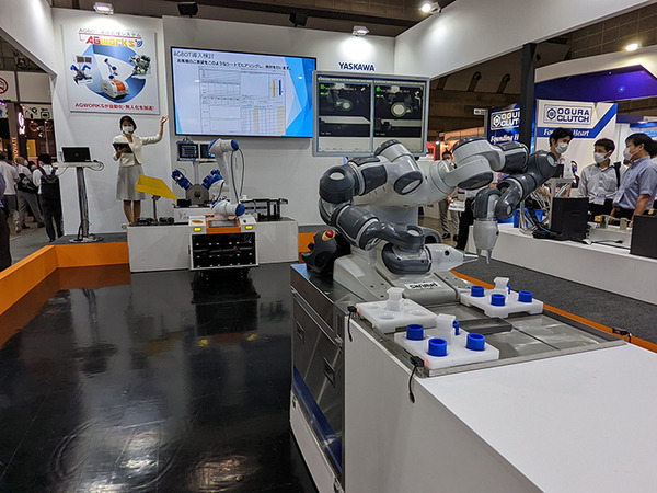株式会社MOSも以前からそういう提案をしている会社の一つ。DOBOT社の小型ロボットを同ロボットの代理店Techshareと共同で、小型ロボットを使ったアプリケーションをデモしていた。また今回はそれだけでなく、事前の3Dシミュレーションによるライン立ち上げの高速化をアピールしていた。