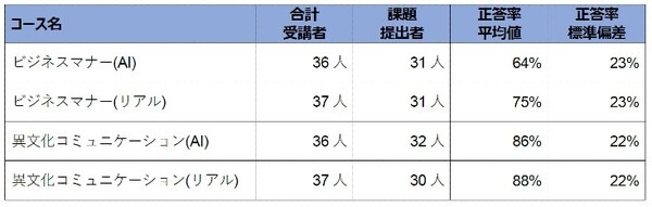 各動画の課題提出者を対象に、平均値と標準偏差を計算したところ、「ビジネスマナー」においてわずかにリアル動画を視聴したグループの方が高かったものの、大きな差はないことがわかった。