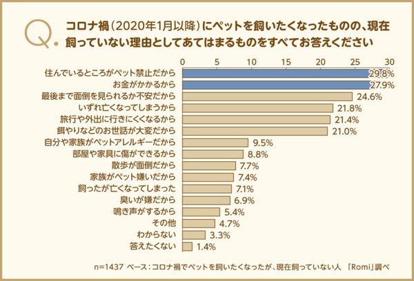 飼いたいと思った理由は「癒やしが欲しかったから」が59.6%で1位、飼えなかった理由については「住んでいるところがペット禁止だから」が29.8%で1位となった。飼えなかった理由については回答がばらけ、また多数選択する人も多かったことから、それぞれがさまざまな事情を抱えていることが伺えた。