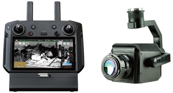 ガス検知用カメラ「OGI640」は中国の大手ドローンメーカーであるDJI社製のMatriceシリーズ向けにカスタマイズされており、Matriceのポートに接続することでドローンからの電源供給を受け、カメラ映像をドローンの映像伝送システムにのせて地上へ伝送することができる。