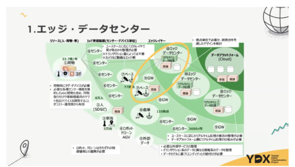 こうした中でエッジコンピューティングはどのような役割を果たしているのか。ヤマト運輸では下図のようなフィジカルアーキテクチャに基づいて、先ほど挙げたような膨大な荷物を取り扱っている。全国に宅急便の営業所は3500か所、ベース店という仕分け拠点は75か所あり、こうしたフィジカルなものをサイバー空間にどうつなげていくかが重要。このため1つのエッジデータセンターが扱う中継地点のデータ処理をいかに効率的に行うかを検証している。
